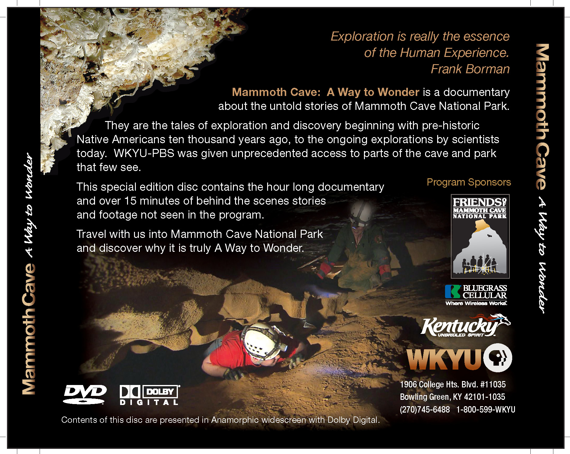 This special edition disc contains the hour long documentary and over 15 minutes of behind the scenes stories and footage not seen in the program. Travel with us into Mammoth Cave National Park and discover why it is truly A Way to Wonder.